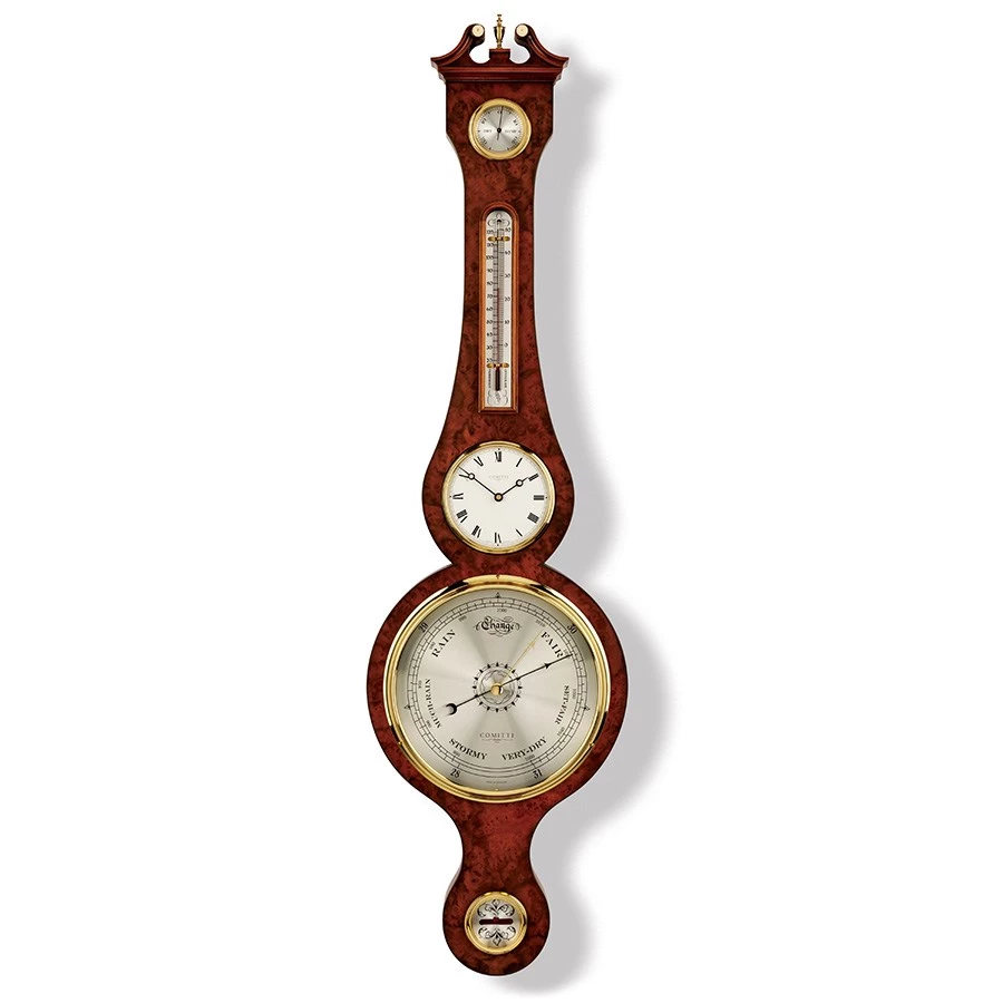 In a style circa 1830, the burr walnut case is inlaid with edgeline and fitted with a hygrometer, thermometer, precision quartz clock, and aneroid barometer. Brass fittings. Handmade in England exclusively for Scully & Scully.