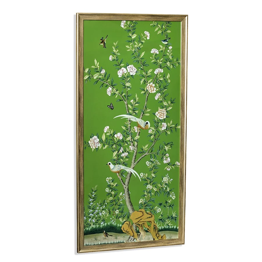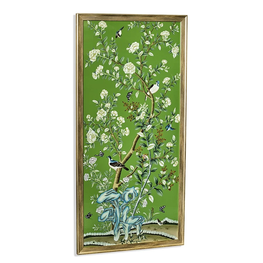 Very elegant and detailed watercolor paintings on silk are ready to complement any room of your home! Each depicts an iconic scene inspired by the famous Regent’s Park in London, featuring roses and traditional birds. Antiqued gold frames are easy to hang with steel wires on back. Sold individually, striking as a pair.