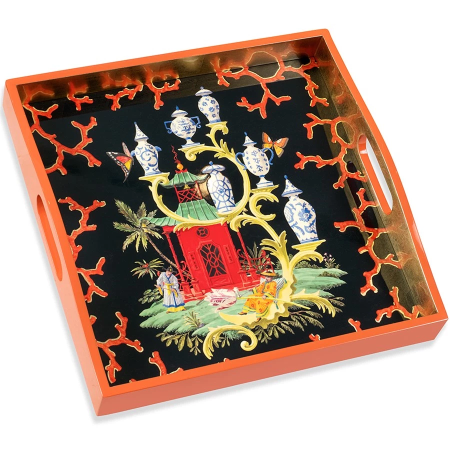 Handmade lacquered wood tray with a detailed Chinoiserie design. Taken from the extensive artwork of American artist Harrison Howard, the tray design is a witty piece blending the hallmark soft colors and curving lines with Chinoiserie inspired scenes. The glossy black background and gold interior edge add additional glamour and drama to the tray.