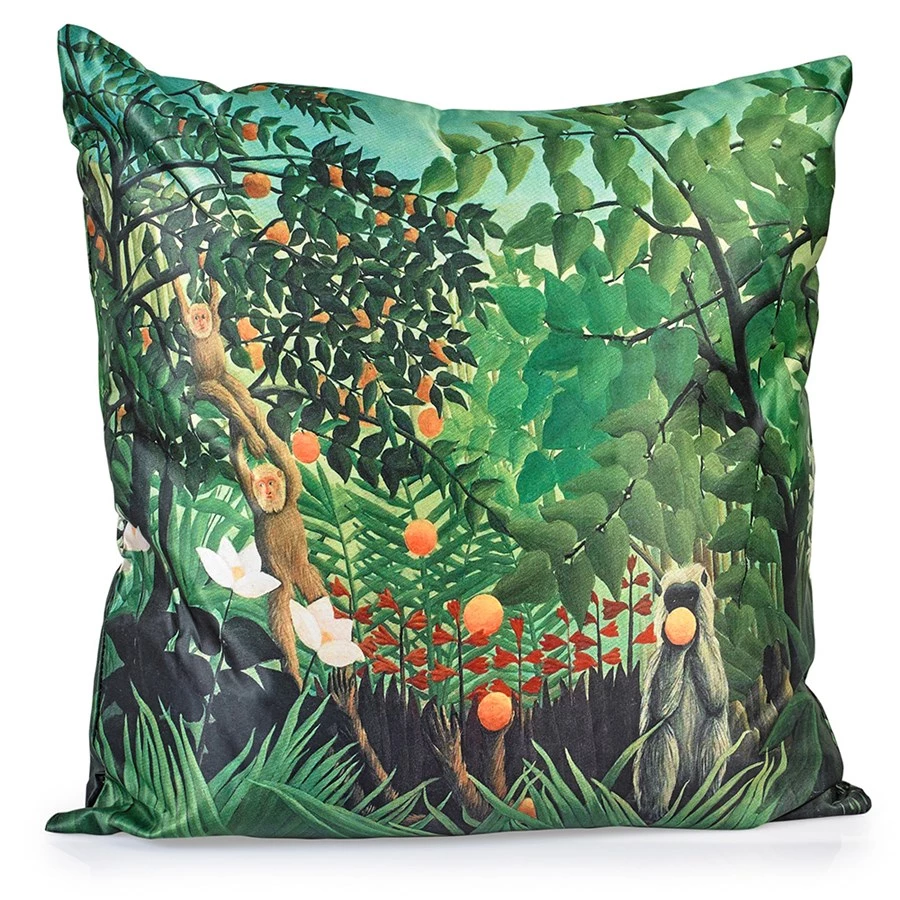 Inspired by the famous artist, Rousseau Jungle Pillows are works art. Printed on the front and back on silky cotton fabric. Fade resistant from exposure. Edges are knife edge finished and an invisible zipper enclosure is included at the bottom.