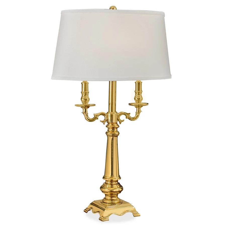 Solid cast brass table lamp features an elegant square pedestal base, all with a timeless polished brass finish. Uses two three-way bulbs up to 150-watts in traditional candelabra style arms.