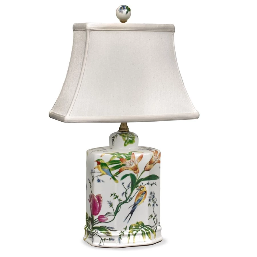 Beautiful blue wash porcelain jar lamp decorated with flowers and colorful songbirds. Two-way socket and uses a bulb up to 60 watts. On and off switch on cord. Piped and trimmed off-white fabric shade.
