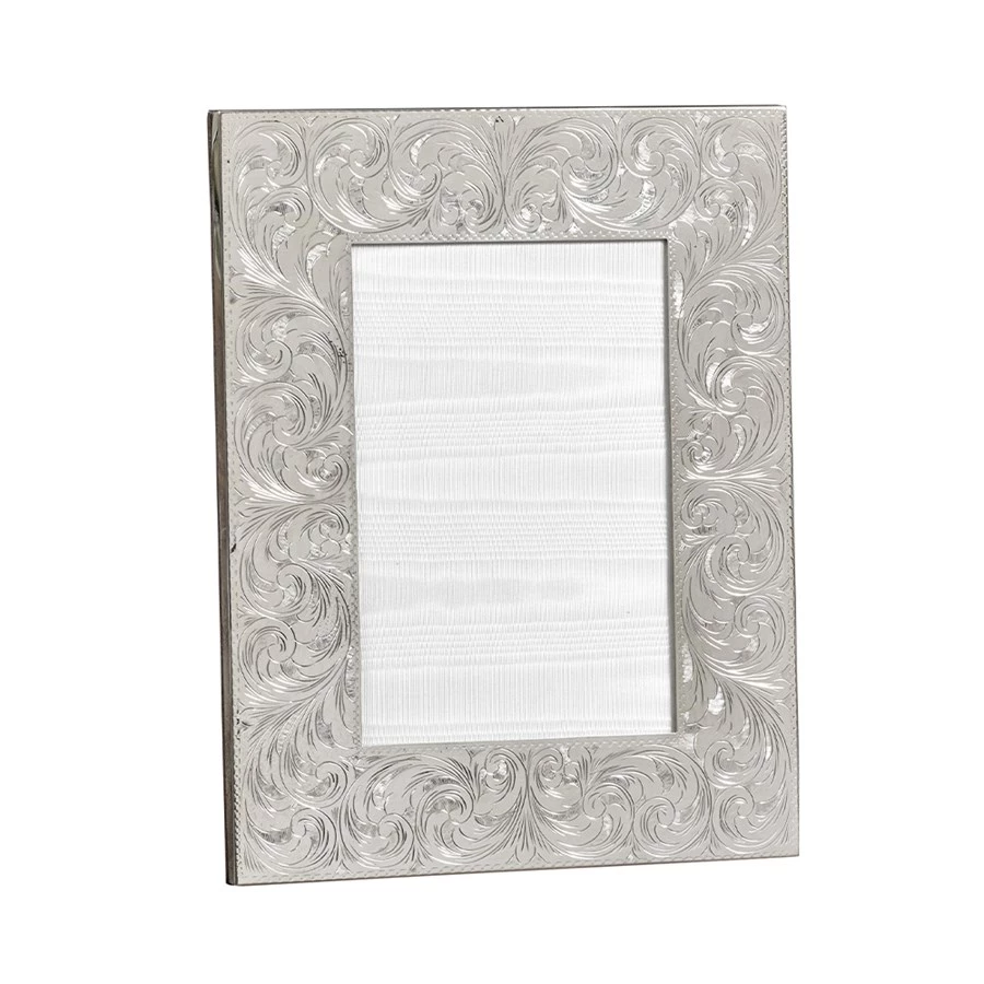 Hallmarked sterling silver frames are ornately engraved with a rich and leafy Edwardian swirl design. High-gloss wood backs have two-way easels. Handmade in Italy. Exclusively at Scully & Scully.