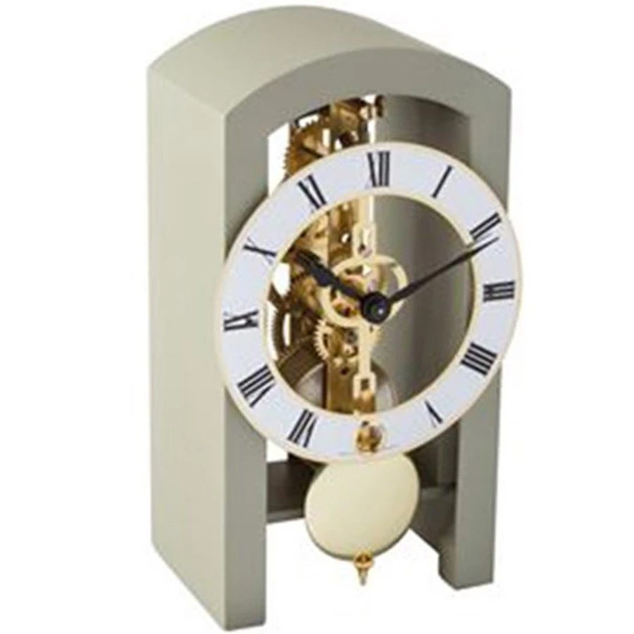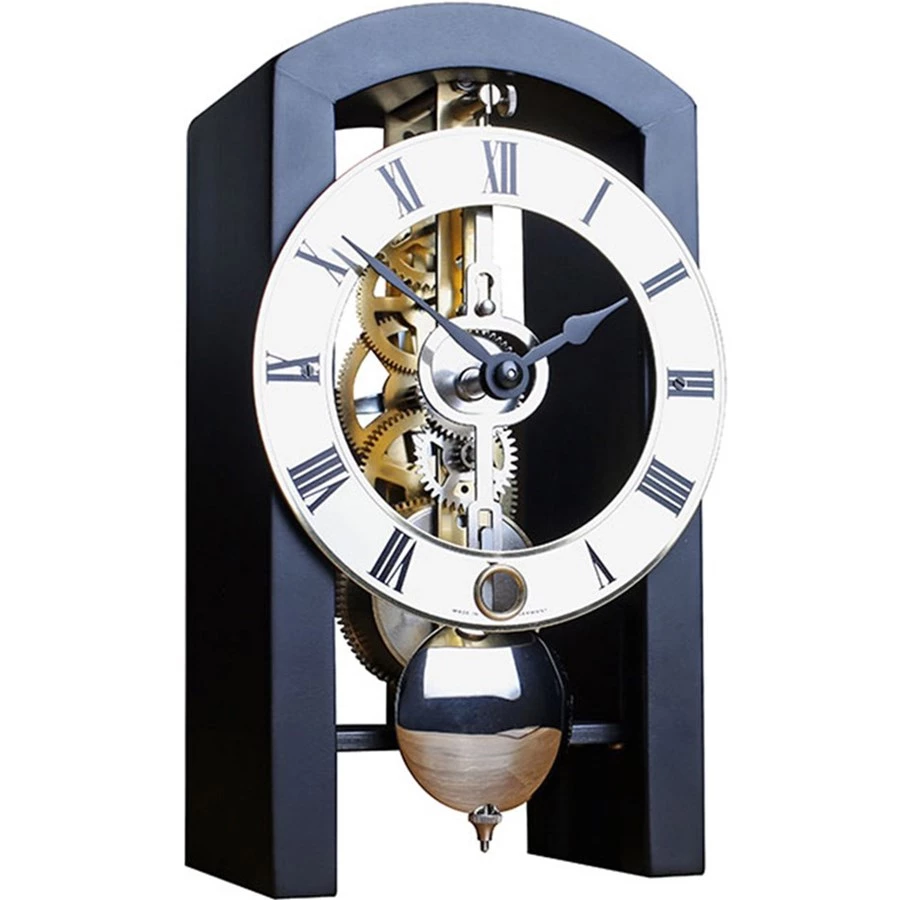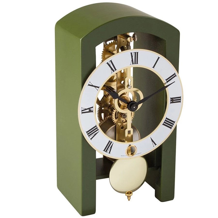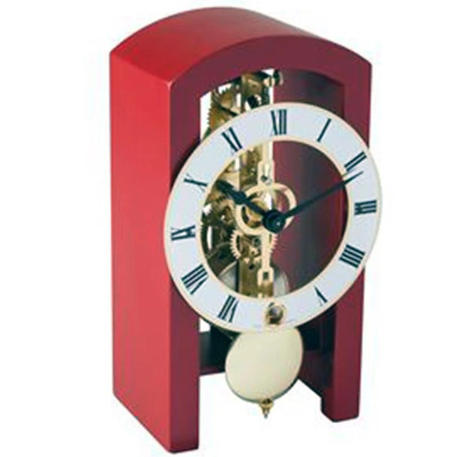 A truly stunning piece perfect for placing in any living or office space. Delicate yet sharp details compliment the dial with a cutout mechanical design, adding a modern touch. Arched wooden case featuring a mechanical only time movement.