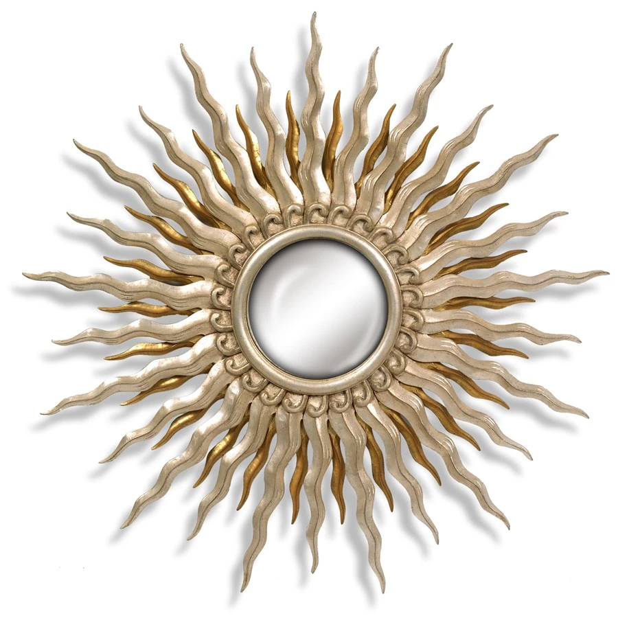 A dazzling sunburst, this mirror has a double layer of undulating rays. Our antique gold leaf and sterling silver leaf finish draws the eye in to the centered flat mirror to create a piece of splendid dimension, movement, and radiance.