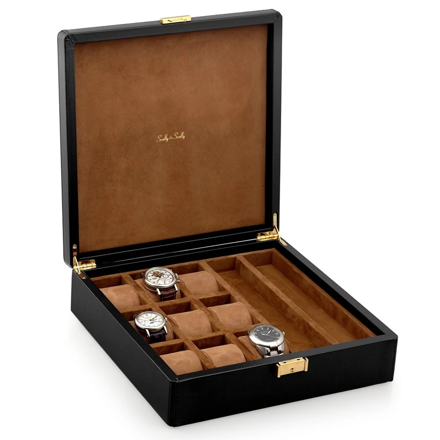 A smart and efficient case, the Tamponato Watch Case holds eleven watches. Nine are held securely on rolls while two are stored at full length. The case is are handmade of leather and brass and lined in velvet. The watch case includes a brass lock and key. Handmade in Italy.