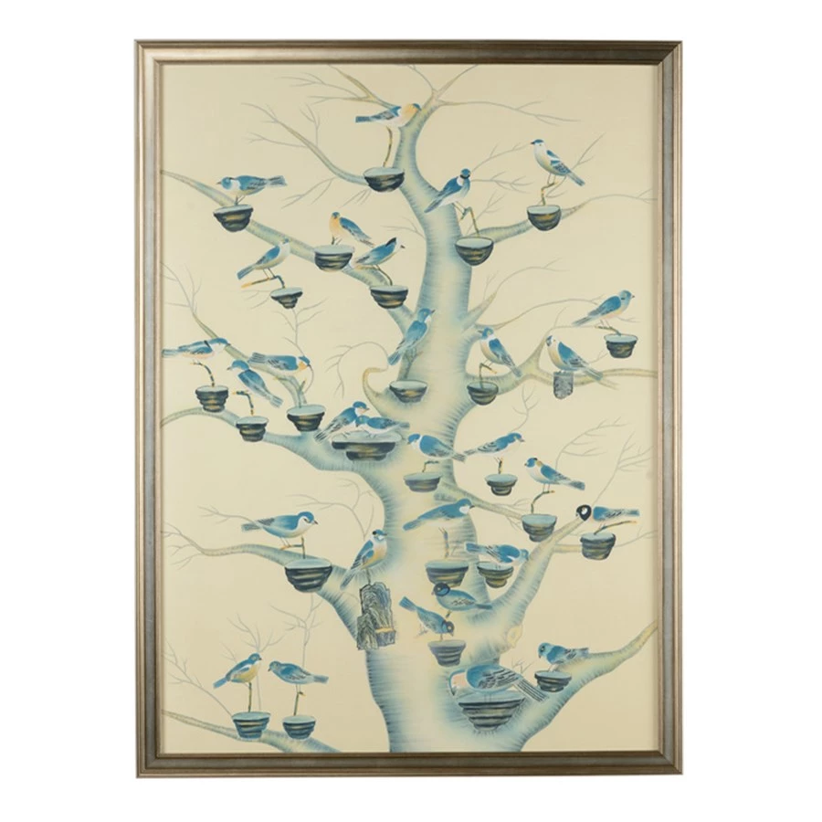 Elegant handpainted watercolor Chinoiserie panel features an uplifting scene of birds in shades of blue flocking on a tree in an aviary. Ready to hang in beautiful antiqued gold and mottled brown frame to complement any room of your home!