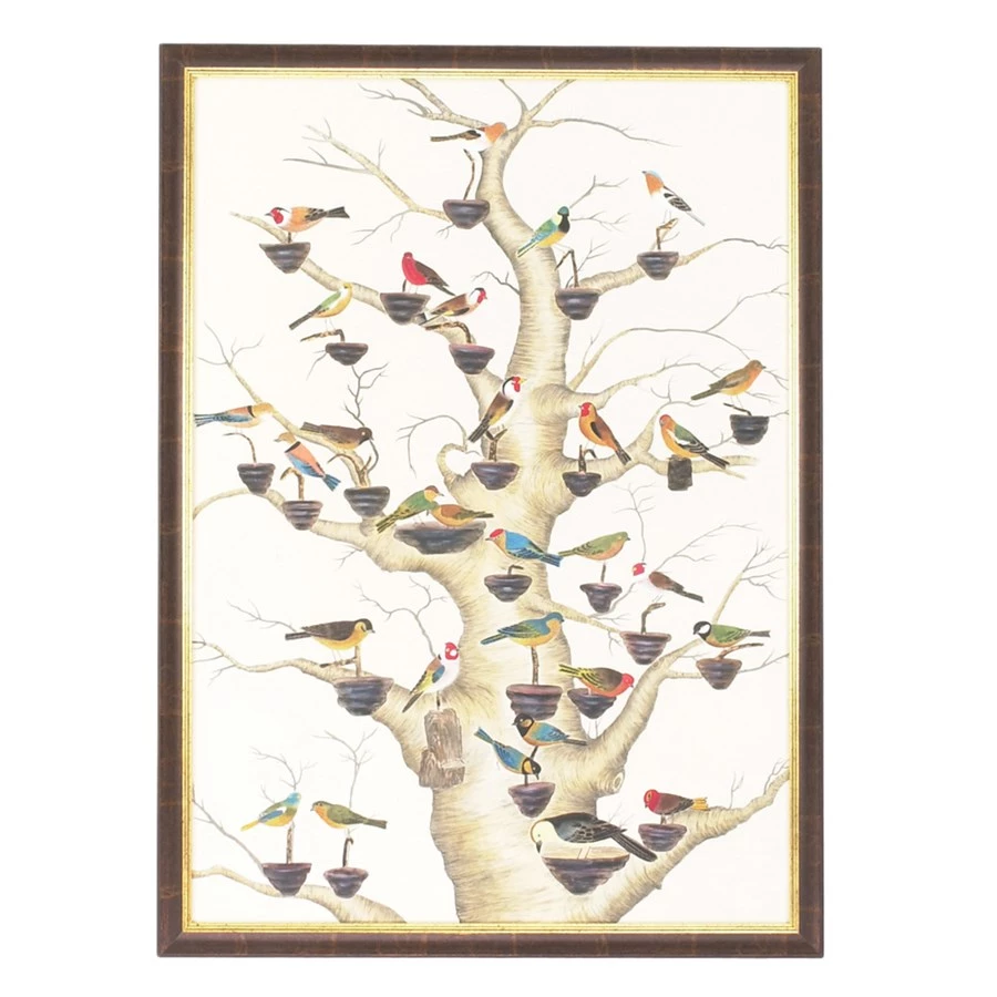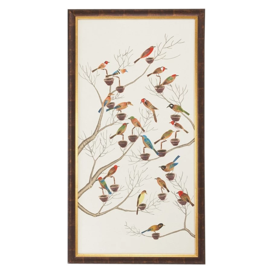 Elegant handpainted watercolor Chinoiserie panels feature an uplifting scene of colorful birds flocking on a tree in an aviary. Ready to hang in beautiful antiqued gold and mottled brown frame to complement any room of your home!