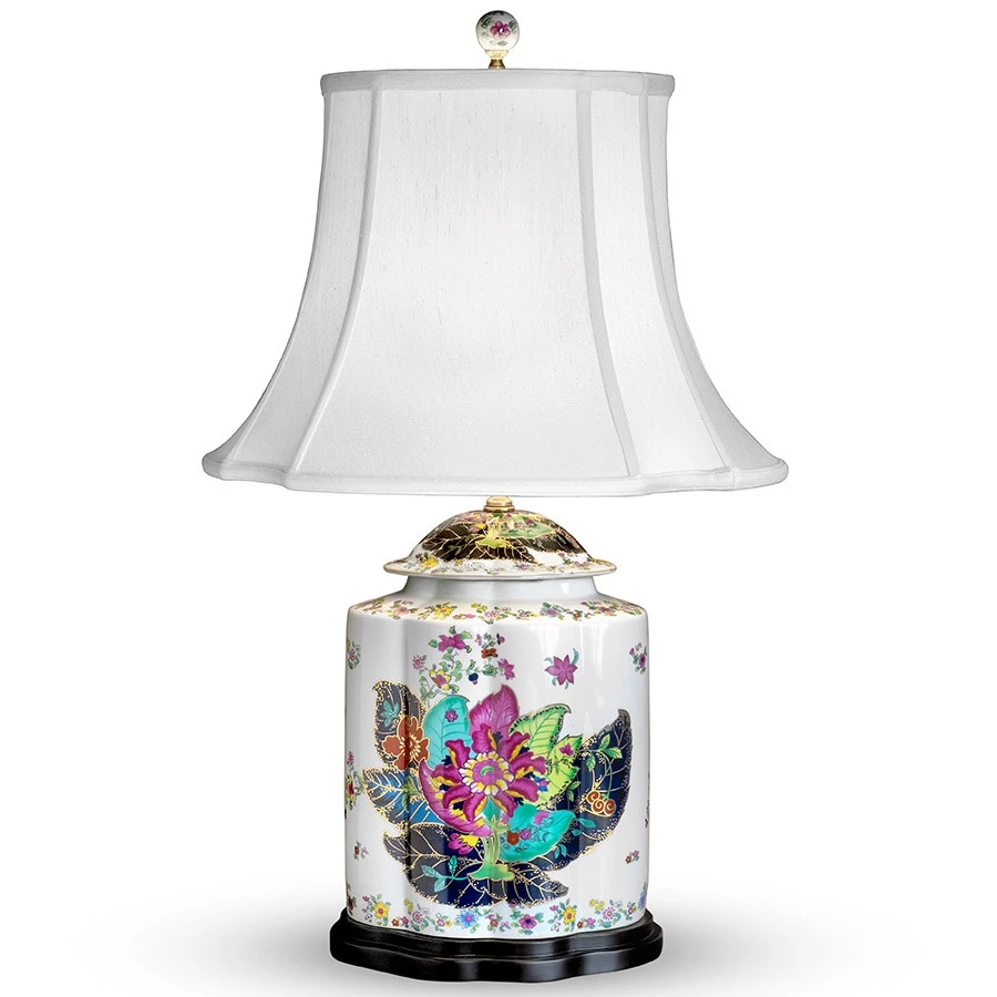 Handpainted porcelain scalloped jar lamp accommodates a three-way bulb up to 150 watts. On-off switch on socket. French oval shade is soft-lined off-white supreme satin.