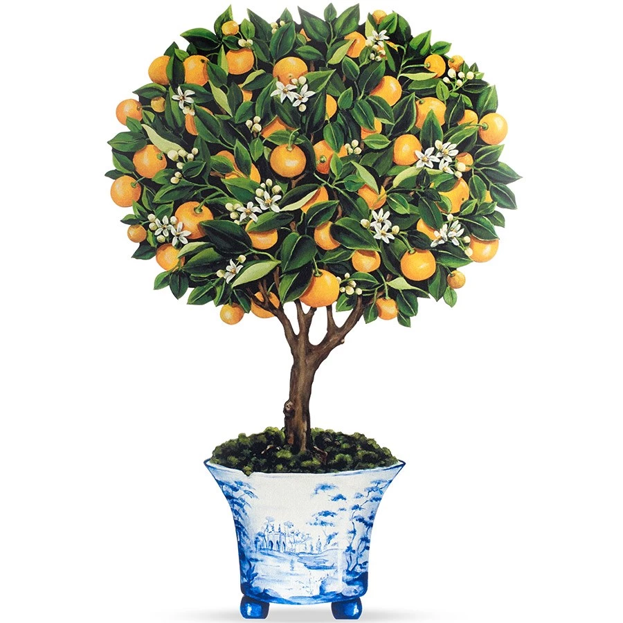Free-standing firescreen-style tree in a chinoiserie pot is printed in pigment varnished onto a flat wood composite board from an original oil painting. Made in America. Exclusively at Scully & Scully.