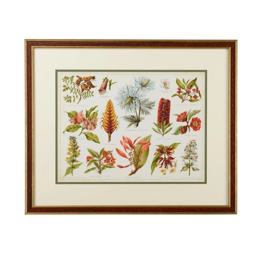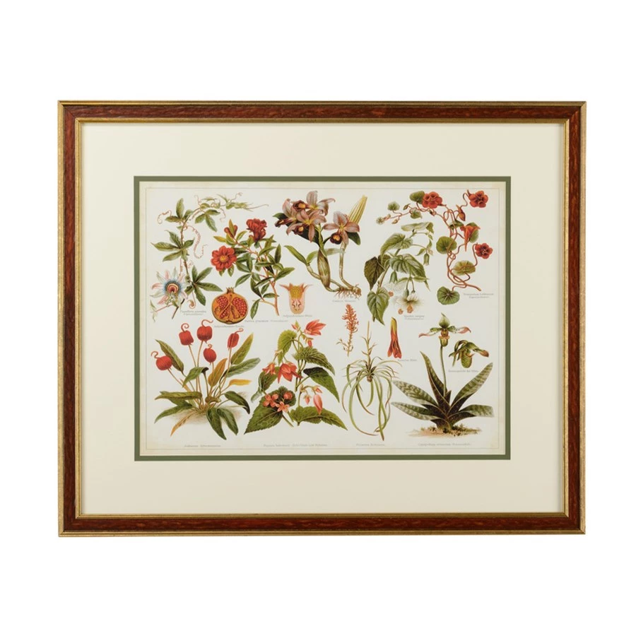 A beautiful giclee print with an attractive double mat and a gold frame. Each giclee features a botanical chart with an array of colorful tropical flora and fauna.
