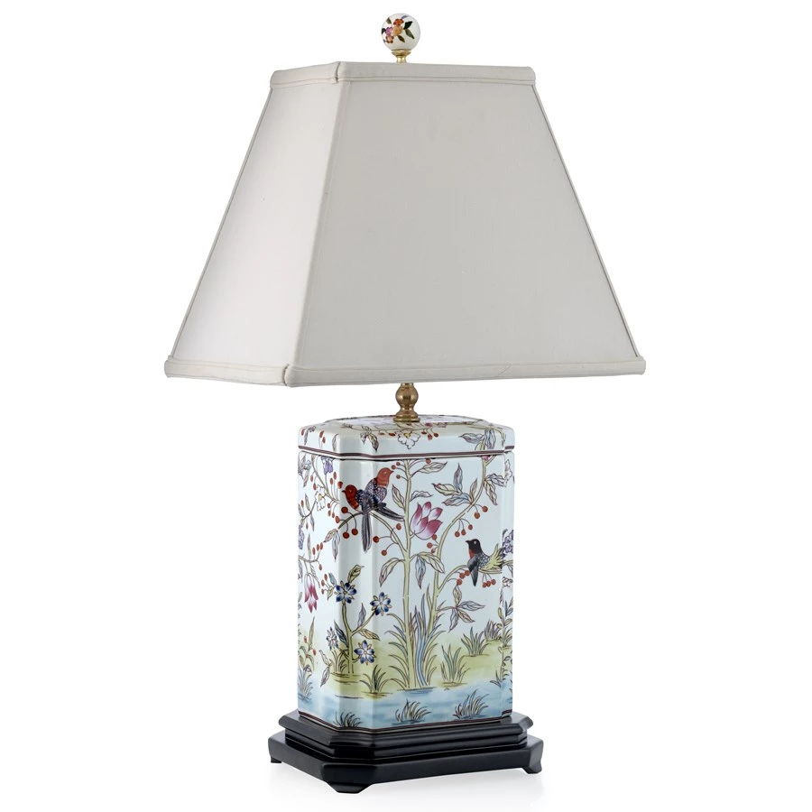 Handpainted porcelain jar with matching handpainted porcelain ball finial. Includes three-way socket up to 100 watts. On-off switch on socket. Off-white lined fabric shade.