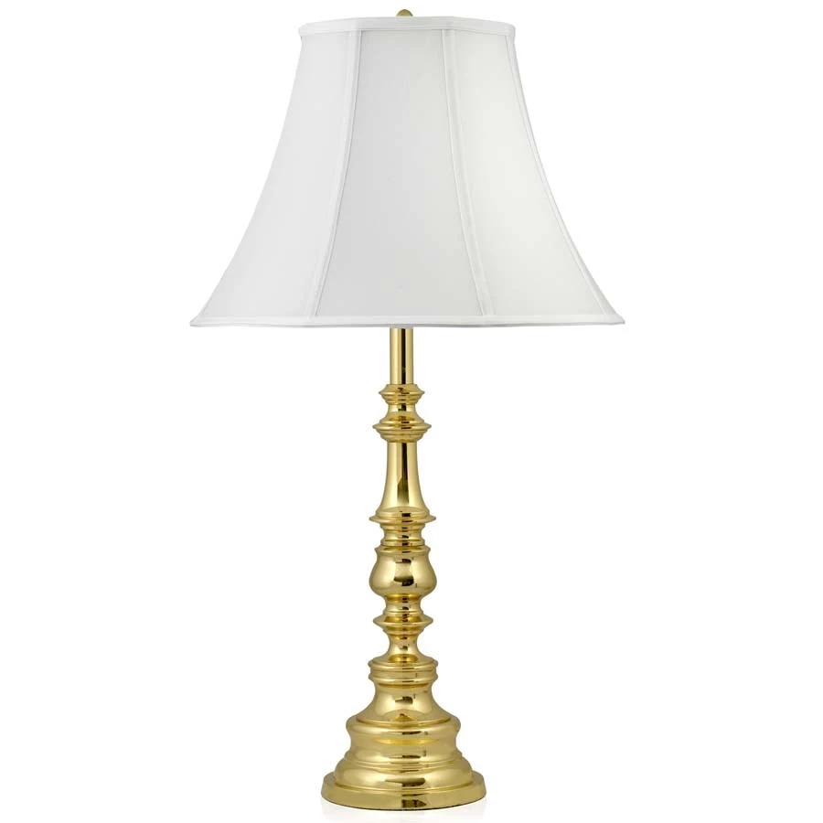 Crafted of solid cast brass, this elegant table lamp has a polished brass finish. Accommodates three-way bulb up to 150 watts. On-off switch on socket. Piped and trimmed linen shade.