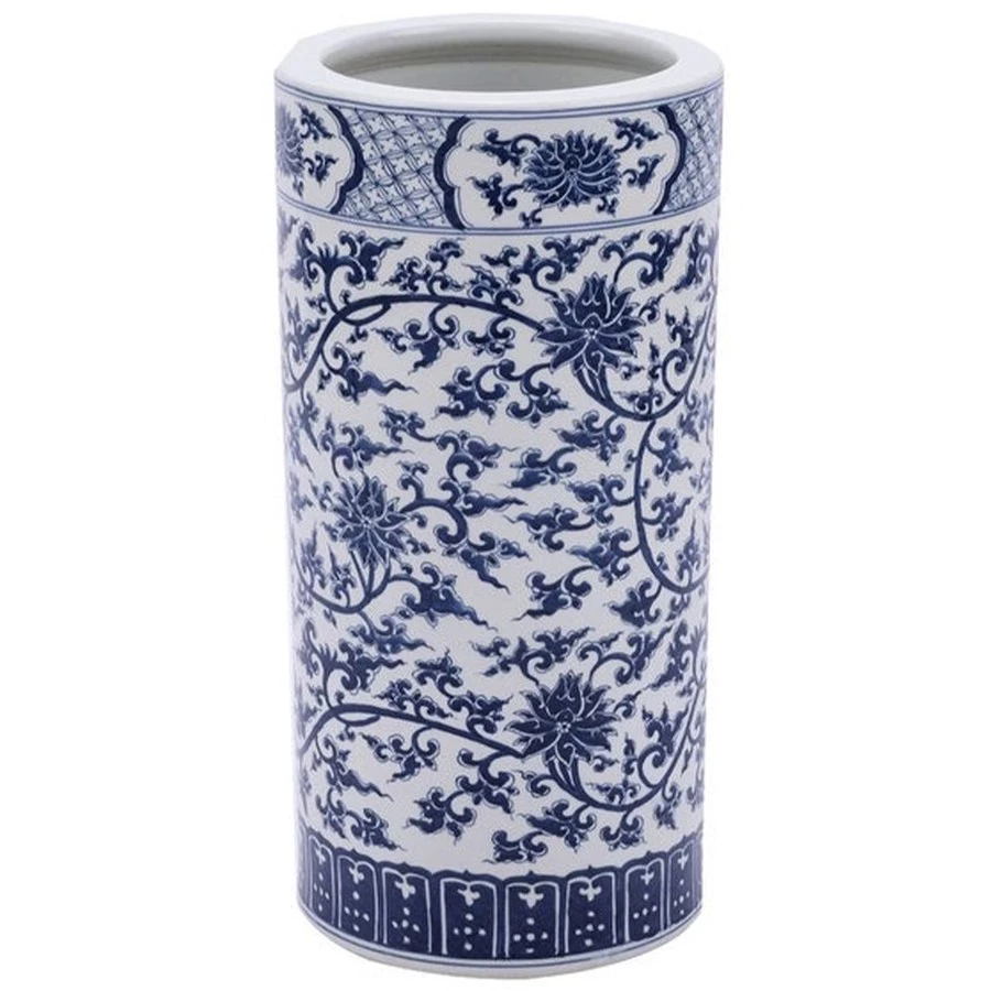 Beautifully handpainted in a lush lotus flower design, this handmade Chinese porcelain umbrella stand is useful and a fine decorative accessory in your entryway.