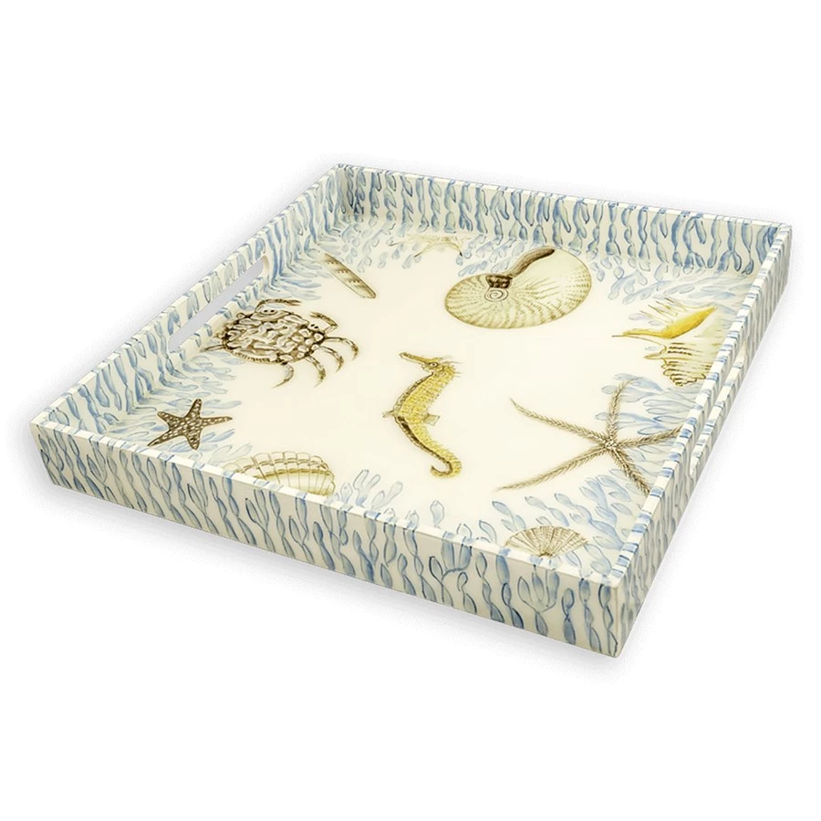 An elegant, individually handpainted wooden tray with multiple coats of lacquer to enhance the deep colors and make it impervious to alcohol and water. Includes handle openings and a protective leather bottom.