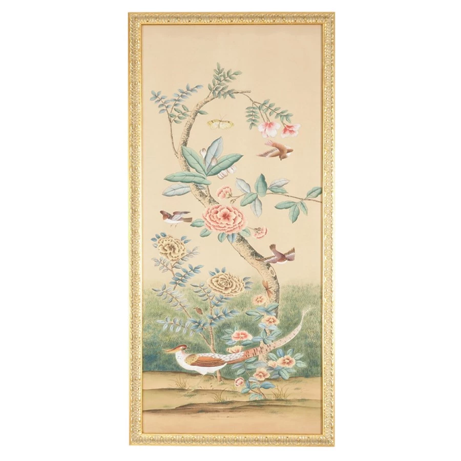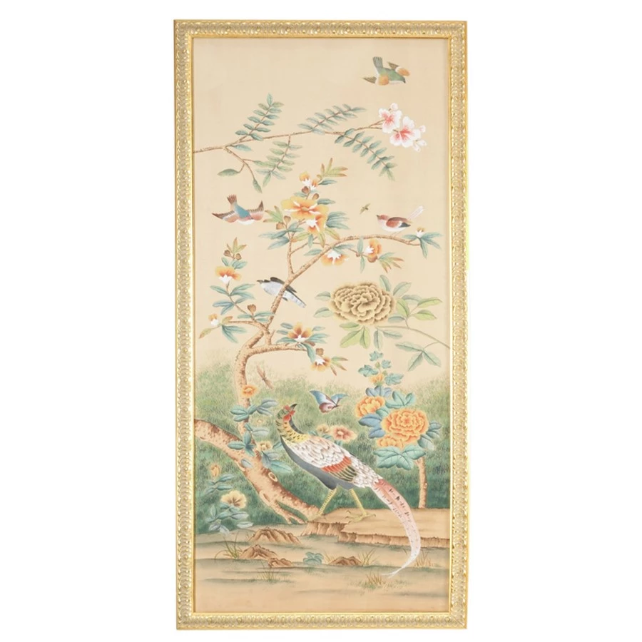 Very elegant watercolor paintings on silk are ready to hang in antiqued gold frames to complement any room of your home! Each depicts an iconic garden scene inspired by Chinese silk panels with traditional birds. Sold individually, striking as a pair.
