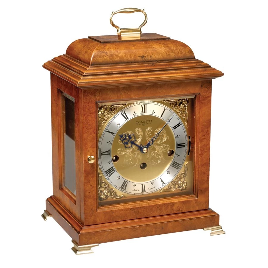 Georgian style basket top case circa 1705, handrubbed and waxed to an antique patina. Polished triple chime 8 day movement with 9 jewel platform escapement and chime silencer. Automatic night silencer (10:00 pm to 7:15 am) and chime sequence correction. Brass dial has cherub spandrels, silver finish chapter ring and fine milled hands. Beveled glasses and lacquered solid brass. Westminster, Whittington and St. Michael melodies on rods. Handmade in England.