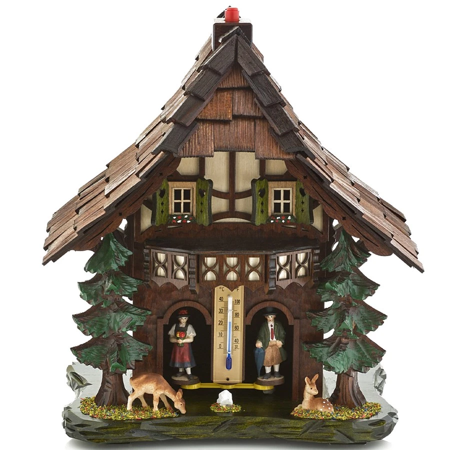 Handcrafted of local woods in the fabled Black Forest by just 25 craftsmen, this Weather House is inspired by the mechanics of a traditional cuckoo clock. As the air changes humidity, the man or woman comes out to signify the weather. Dry air is indicated when the woman is out of the house and the man comes out as humidity levels rise. The Weather House includes a thermometer with both Celsius and Fahrenheit markings. Handmade and handpainted in Germany.