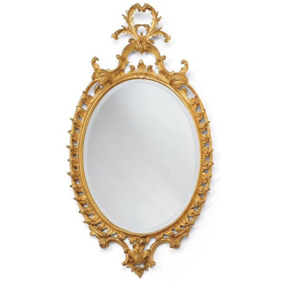 The Governor’s Palace oval looking glass, which features intricately pierced foliage and open symmetrical C-scrolls, is reproduced from an English Chippendale example made around 1765. Currently exhibited in the Governor’s Palace dining room at Colonial Williamsburg, the looking glass reflects the fashion of furnishings found in the inventory of Lord Botetourt, one of the last royal governors to occupy the Palace. Antique gold leaf finish with beveled mirror.