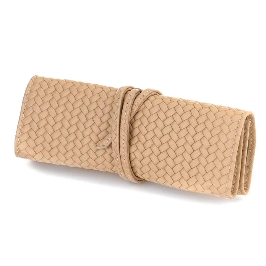 Naturally tanned calfskin travel jewelry roll in woven construction. The interior is lined with genuine suede leather. Four zippered compartments and a snap strap for rings. Each rolls up and ties with thin leather straps.Entirely handmade in Germany. Exclusively at Scully & Scully.