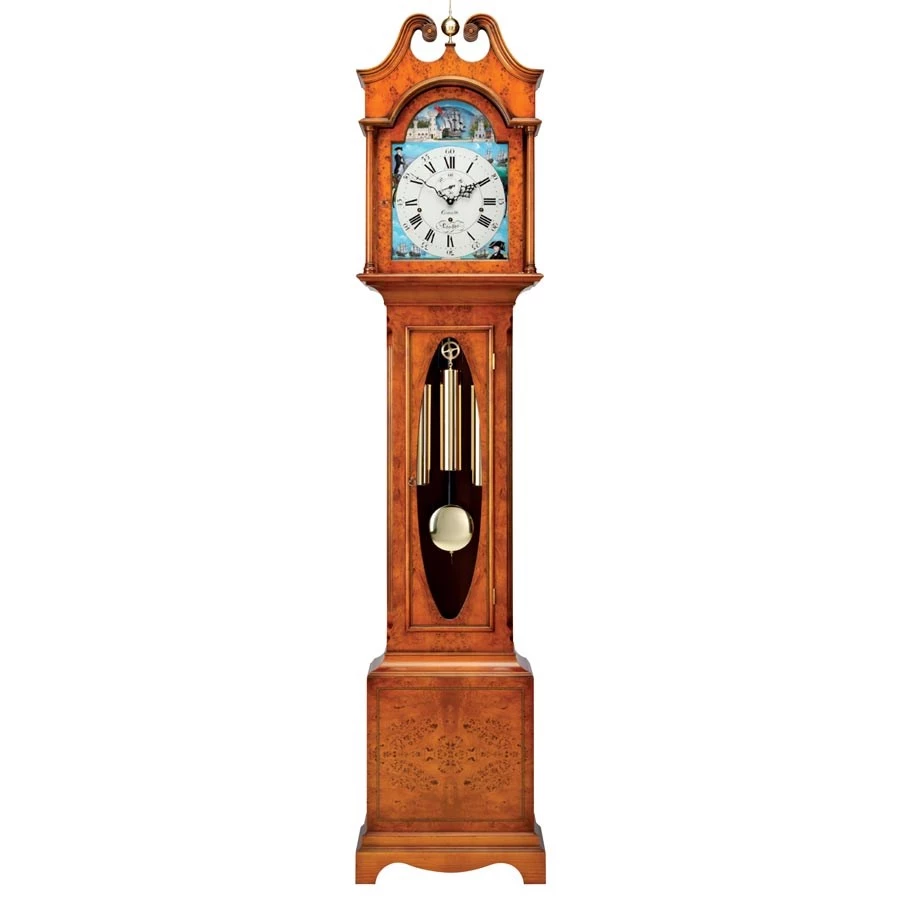 Scroll top triple chime grandfather clock with a solid cherry cabinet decorated with book matched burr yew veneers inlaid with rope edgeline. The case is hand rubbed and waxed to achieve an antiqued patina. The clock features a hand painted dial celebrating the Battle of Trafalgar in 1805. Illustrated are Admiral Nelson, Captain Thomas Hardy and French and Spanish ships engaged in battle. The flagship HMS Victory rocks with the swing of the pendulum. Made in England.